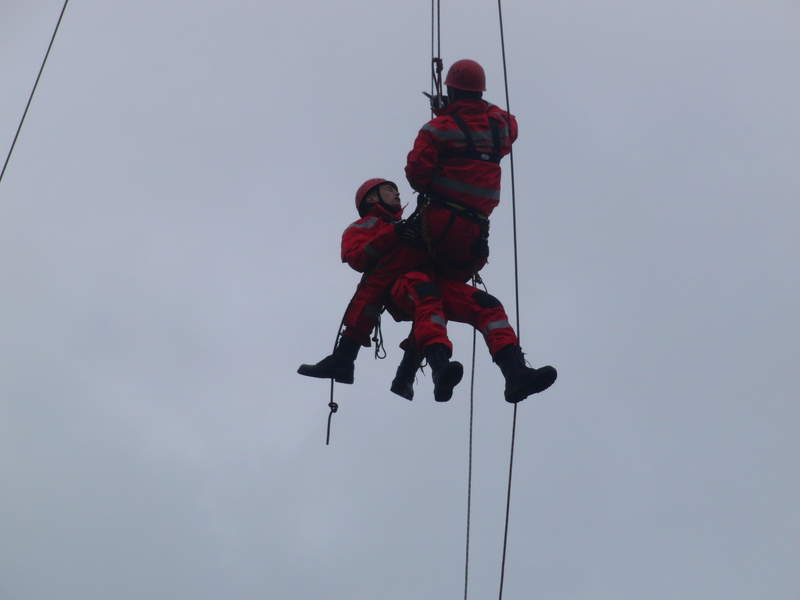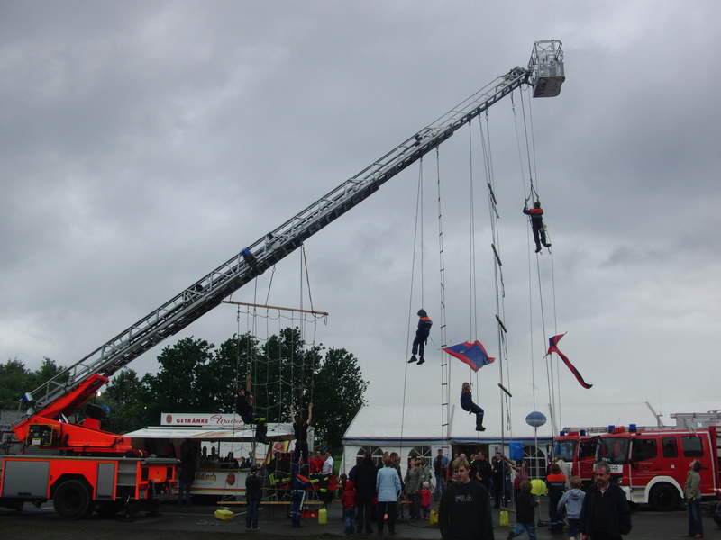 Die Höhenretter (stationiert auf Feuerwache 4 in Köln-Ehrenfeld) bereiten sich auf ihre Vorführung an der Drehleiter vor.