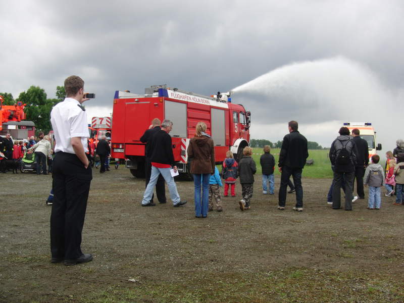 Der Festplatz füllt sich mit Fahrzeugen. Vorne hat sich der Gerätewagen Wasserrettung der Berufsfeuerwehr Köln aufgebaut, dahinter schiebt sich das RIV der Flughafenfeuerwehr Köln/Bonn auf den Platz.