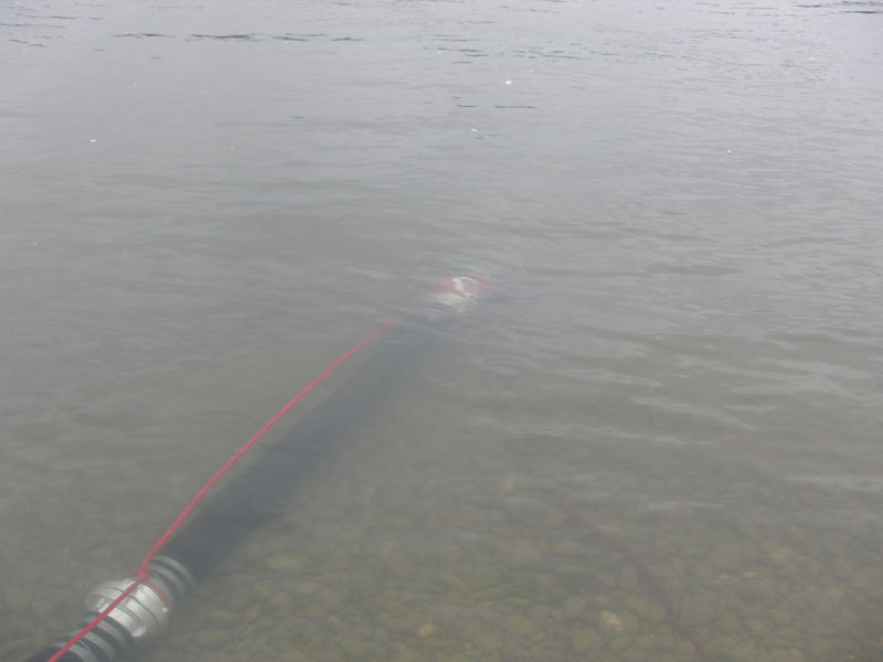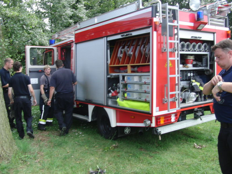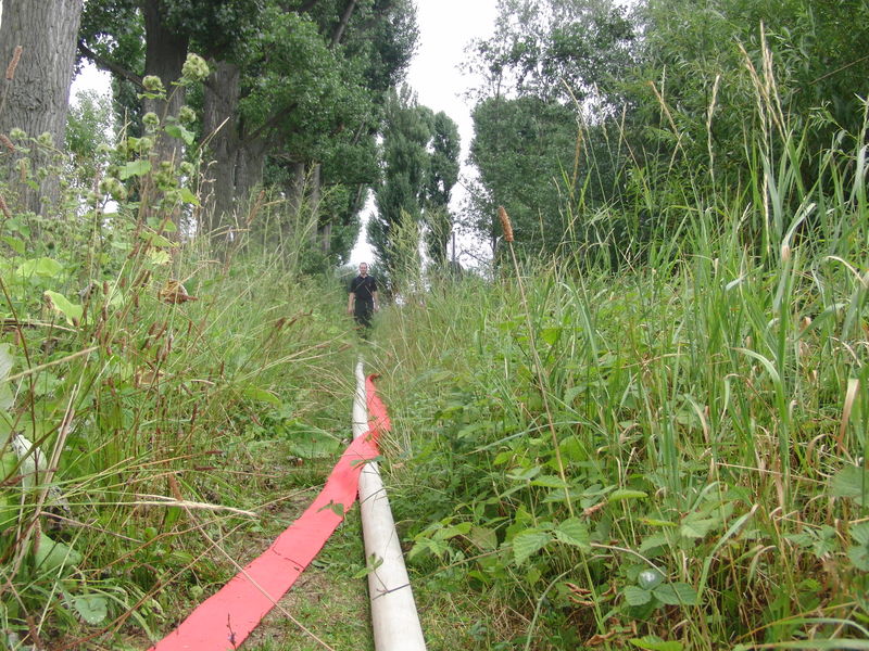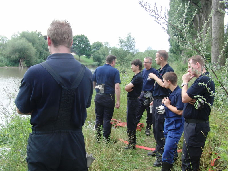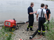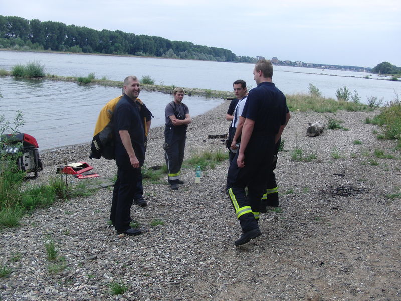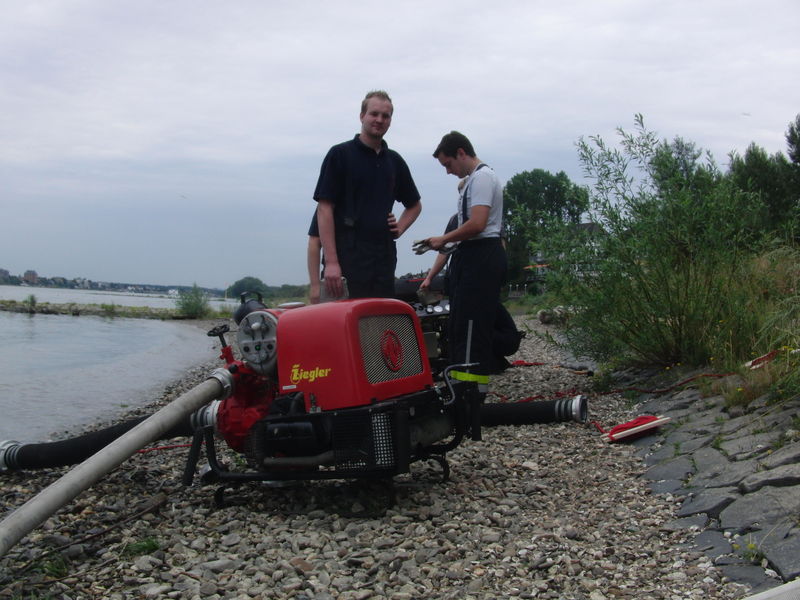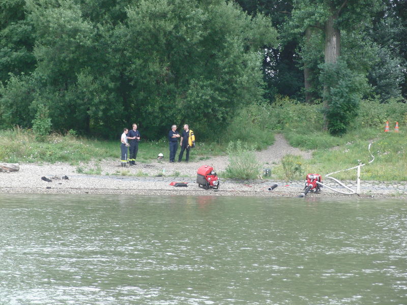 Schauplatz unserer Übung war das Rheinufer in Höhe des Rheinkilometers 673,4 (rechtsrheinisch), geplanter Beginn war 10:30 Uhr. Die Löschgruppe Libur traf am Übungsort mit etwas Verspätung ein (Einsatz BAUM), brachte aber dann die Tragkraftspritze unseres zweiten Löschfahrzeugs zum Einsatz. Nachdem die Schlauchleitungen verlegt waren, begann die Wasserförderung. Die von der Löschgruppe Langel mitgebrachte Tragkraftspritze – ein deutlich moderneres Modell als unsere (Elektrostarter statt Handkurbel) – verabschiedete sich nach kurzer Laufzeit mit einem ordentlichen Knall aus der Übung. Dabei zeigt sich der konkrete Sinn einer solchen Übung: Neben der Überprüfung des Materials und der Fähigkeiten der Mannschaft konnte so auch die Beschaffung eines Ersatzgerätes geprobt werden.