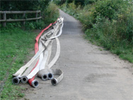 Der Feuerwehr Köln stehen im Stadtgebiet mehrere Löschgruppen bereit, deren Hauptaufgabe eben diese Wasserförderung über lange Wegstrecken ist. Ausgerüstet mit einem Schlauchwagen und den nötigen Pumpen lässt sich so eine Wasserversorgung bereitstellen. Sowohl die Löschgruppe Langel als auch wir haben eigentlich andere Aufgaben (Ausleuchtung von Einsatzstellen oder Technische Hilfe) – dennoch wollten wir einmal ausprobieren, was sich im Einsatzfall mit unseren Mitteln bewerkstelligen lässt.