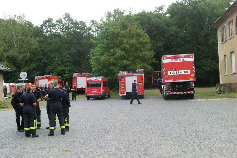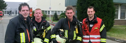 Nach der Übung bei der Deutz AG: Dem Angriffstrupp aus Libur ist die Anstrengung deutlich anzusehen.Die letzte Übungsstation an diesem Tag wurde von uns schon mit Spannung erwartet, handelte es sich doch um eine Einsatzübung, bei der die technische Hilfe im Vordergrund stand. Die Löschgruppe Libur verfügt als eine von