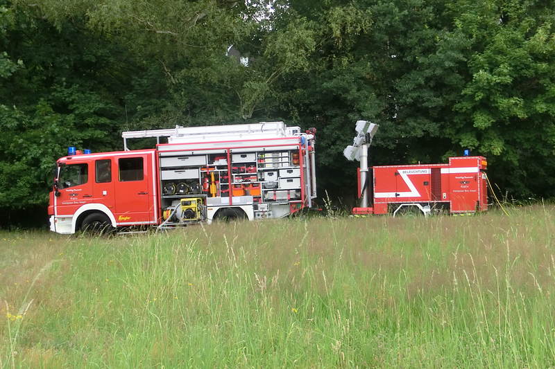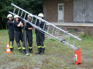 Teamspiel-Lösung mit dem „Liburer Modell“: Wo andere Teams einen Kran bauten, griffen wir schnell und effektiv zum großen Hebel.Die nächste praktische Übung stellte da schon ganz andere Anforderungen an die Teilnehmer: Im Fluchttreppenhaus der ICE- und S-Bahn-Trasse, die zum Flughafen KölnBonn führt, wurde ein Brand angenommen. Die Löschgruppe Libur war bei dieser Übung zusammen mit der Löschgruppe Heumar eingeteilt und als erstes Fahrzeug am Ort. Schnell wurde die Lage durch den Gruppenführer erkundet, der seinen Angriffstrupp in das Fluchttreppenhaus schickte. Dort wurde recht bald eine der zwei vermissten Personen gefunden und aus dem Treppenhaus geführt. Zeitgleich begannt der Angriffstrupp der in der Zwischenzeit eingetroffenen Löschgruppe Heumar seinen Abstieg in das Treppenhaus und meldete wenig später, dass auch die zweite vermisste Person gefunden wurde.